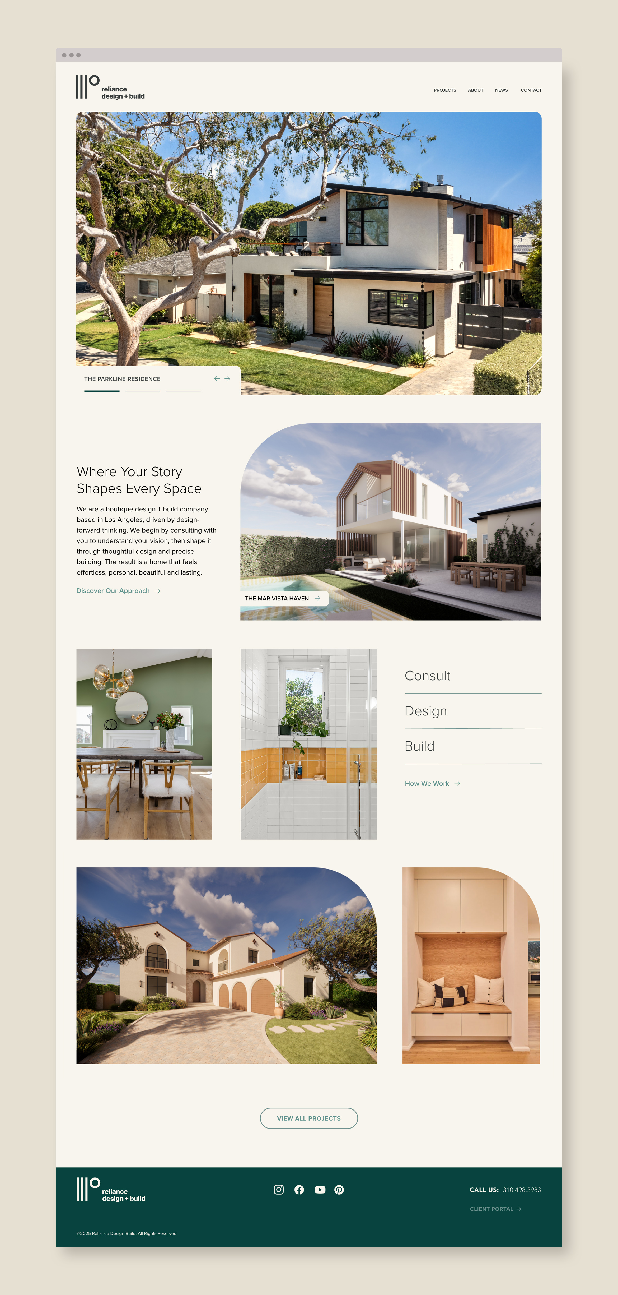 Reliance is a boutique design + build company based in Los Angeles, driven by design-forward thinking. The brand identity and website redesign shows a sophistication and simplicity that helps depict the idea that they take care of everything for you–beginning by consulting with you to understand your vision, to shaping a new home through thoughtful design and precise building.